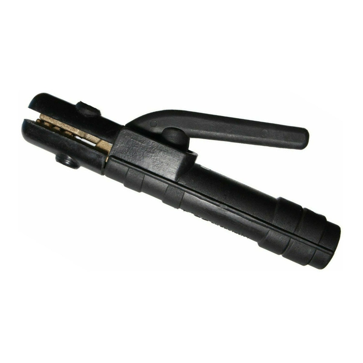 Crocodile type electrode holder with spring loaded jaws that firmly grip the rod end.