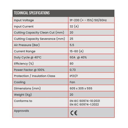 This IGBT inverter power source is highly efficient, and equipped with air pressure adjustment. Optional extras include a circle cutting attachment (SCP2550) and inverter trolley (CAP0216).