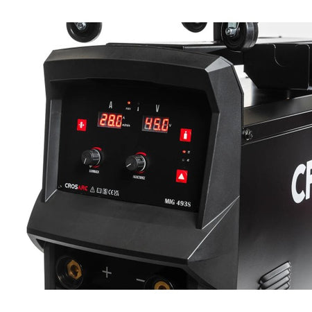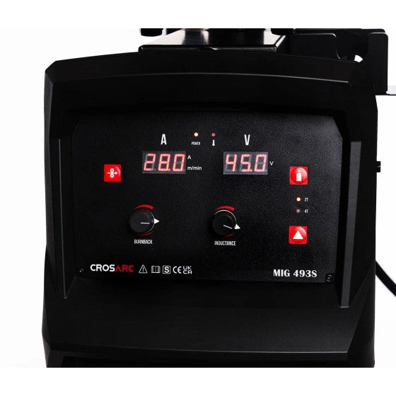 The separate 4-roll wire feed system ensures smooth and stable wire delivery, making it especially suited for longer torches and larger spools. Mounted on a robust trolley for workshop mobility, the 493S is a serious performer built for serious work.