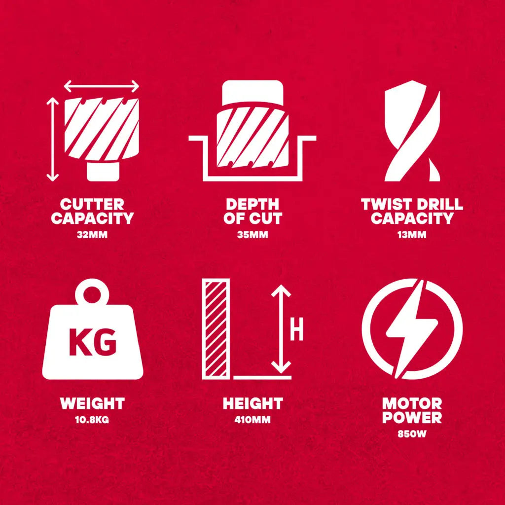 Suitable for drilling up to 32mm diameter by 35mm depth.