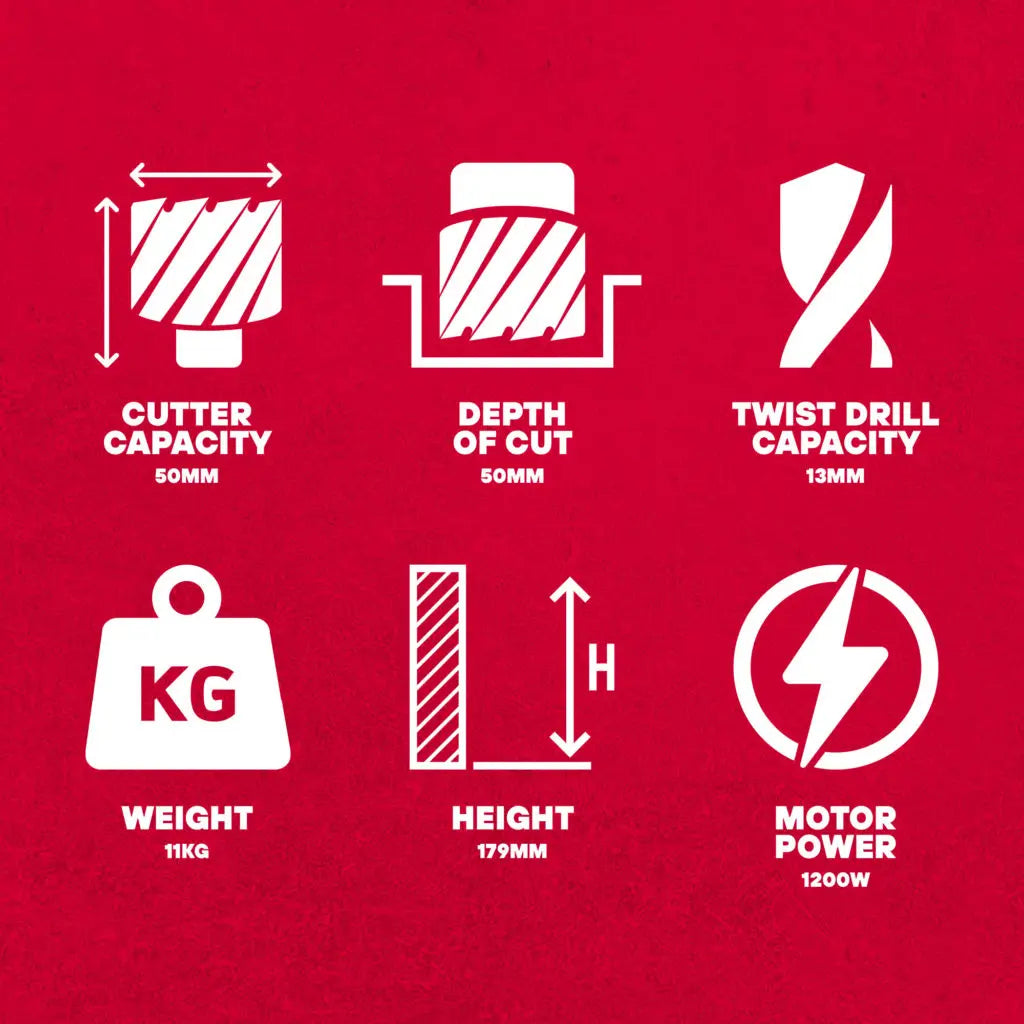 Cutting diameter and depth of cut to 50mm- The largest capacity of any Low Profile drill on the market.