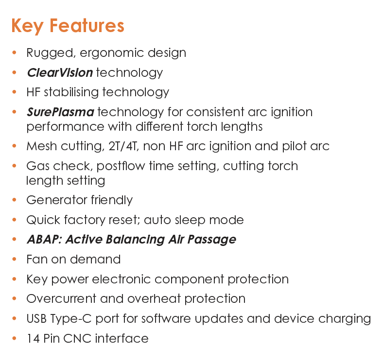 Engineered for convenience, it boasts ABAP (Active Balancing Air Passage) to dissipate internal heat, fan-on-demand, and easy postflow time settings to ensure durability and efficiency. Compatible with AVR generators and equipped with overcurrent and overheat protection, it’s ready to tackle any job site or remote project. Need software updates on the go? The integrated USB Type-C port allows for seamless upgrades and on-device charging, while the 14-pin CNC interface enables precision-driven automation when paired with the optional TM-125 machine torch.