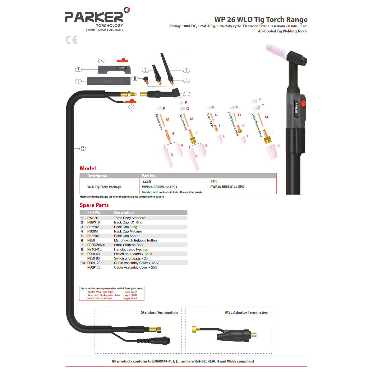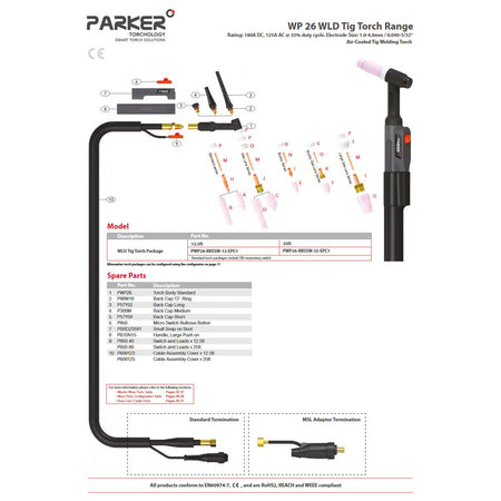 The Parker Torchology WP26 WLD air cooled TIG welding torch is guaranteed 100% Weldcraft compatible and comes in 4 metre (12.5ft) or 8 metre (25ft) lengths to suit your needs.